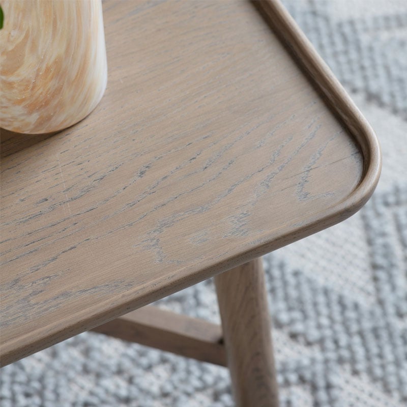 - A square coffee table made using solid European Oak in a grey dry sheen level finish.