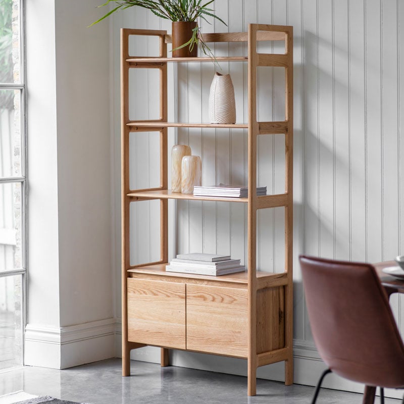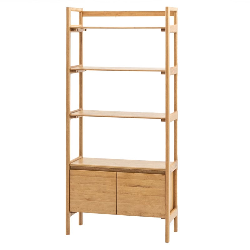 - With a strong elegant design, this Rustic Scandi Japandi Solid Light Oak Wood 4 Tier 2 Door Bookcase Shelving Display Unit Cabinet is a true showstopper.