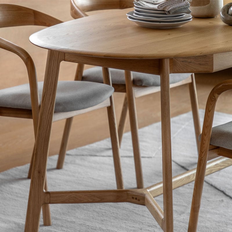 This extending dining table is a stylish and functional addition to any dining space. Its oval shape creates a modern and inviting look. The table can be easily extended to accommodate additional guests, making it perfect for entertaining. The sleek, tapered legs add a touch of Scandinavian minimalism, while the natural wood finish complements a variety of interior styles.