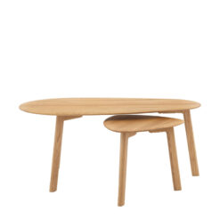 This coffee table nest is a stylish and functional addition to any living space. This set of two tables features organic, oval shapes and tapered legs that create a modern and minimalist look. The smaller table can be tucked neatly beneath the larger one when not in use, making it a space-saving solution for smaller rooms. Perfect for displaying decorative items, serving drinks, or simply adding a touch of Scandinavian style to your home.
