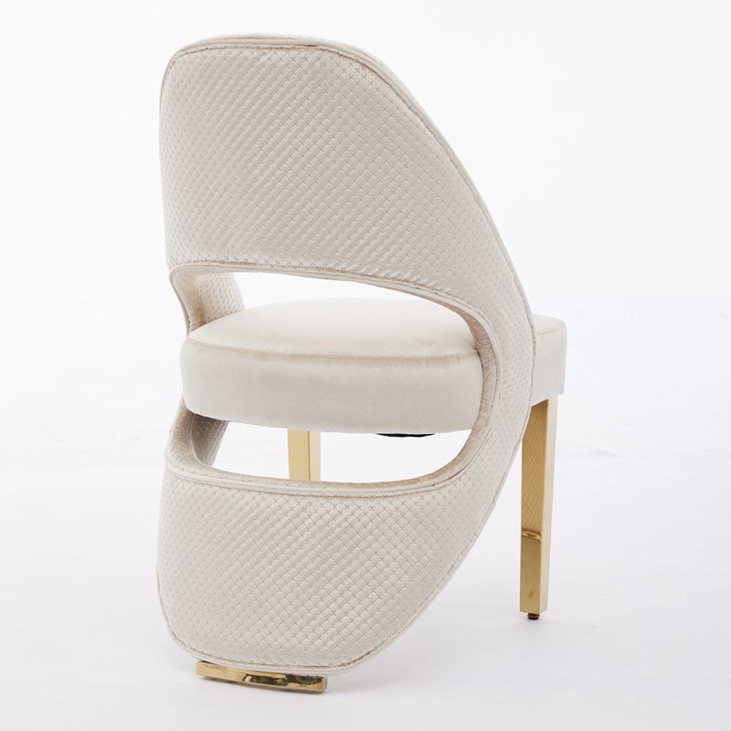 This Set Of 2 Art Deco Open Curved Drop Back Cream Velvet And Gold Metal Quilted Dining Chairs exudes luxury and sophistication, and is designed to make a statement in any dining room. Featuring a soft cream velvet fabric upholstery, these chairs offer a serene and inviting aesthetic, while the elegant gold-finished metal frame adds a touch of opulence. The graceful curves and contemporary design make them a perfect blend of classic charm and modern appeal.