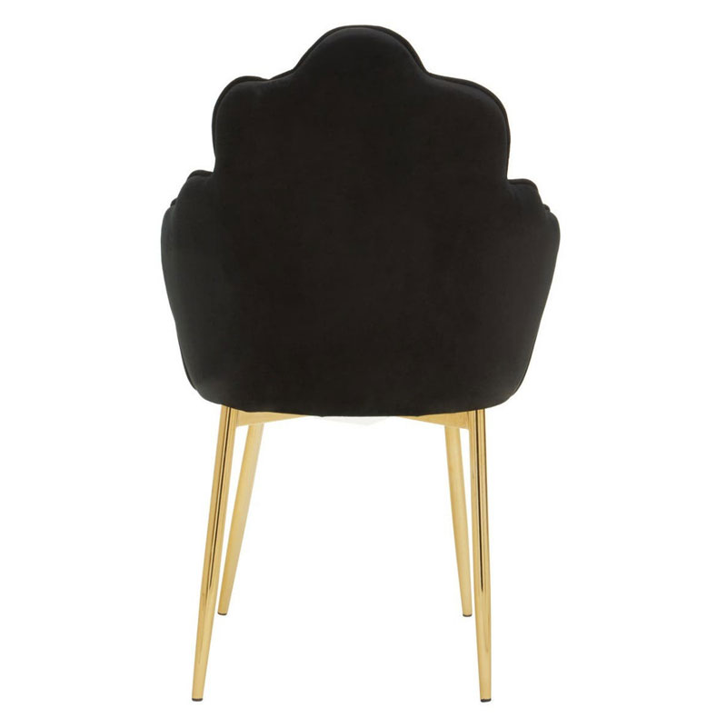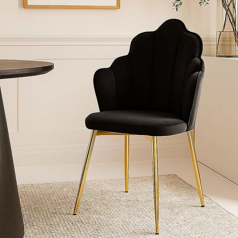 This dining chair is upholstered skilfully with black velvet that works wonderfully in a variety of decors. Featuring a sensuous scalloped edge, the foam-padded seat is perched atop gold finish tapered legs which adds a chic accent to the living area.